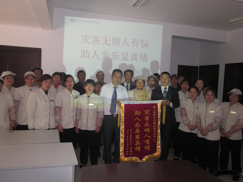 2010年云南大旱,昆百大向集團內(nèi)所有員工發(fā)起為云南父老鄉(xiāng)親獻愛心倡議, 3590人捐款8.5萬元,并將善款購買成礦泉水送到受災(zāi)地區(qū)。同時,集團積極參與中國扶貧基金會“甘霖行動”,將20萬元物資送到災(zāi)區(qū)人民手中,救助災(zāi)民4100余人次。西南廣場25名黨員2010年3月抗旱救災(zāi)向商務(wù)局捐款3350元。